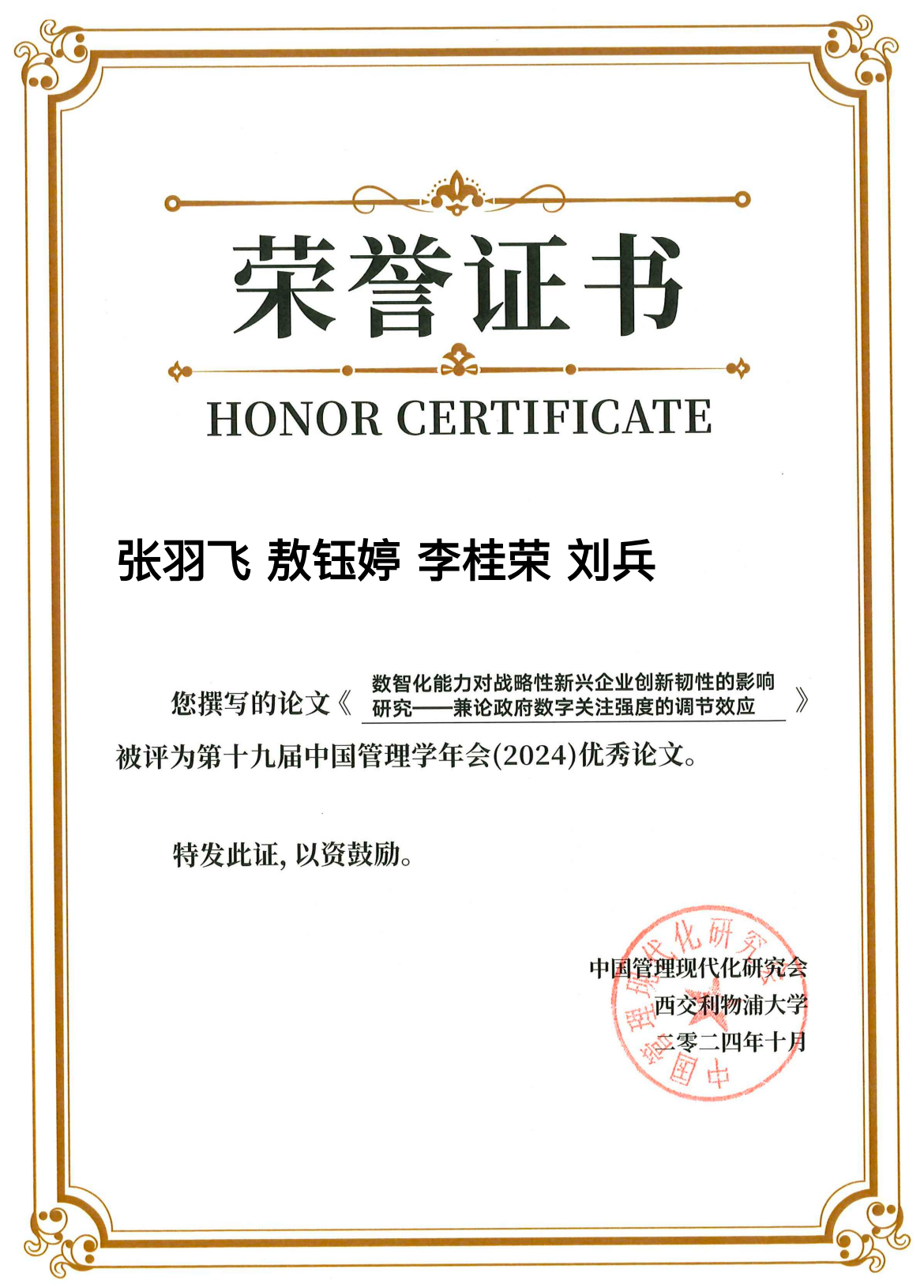 2024年10月25日-27日,由中国管理现代化研究会主办、西交利物浦大学承办的第十九届(2024)管理学年会在江苏省太仓市西浦创业家学院隆重举办。来自北京大学、复旦大学、厦门大学等多所高校和来自海内外管理学界逾千位专家学者、政府及企业代表齐聚苏州,围绕“数智化转型与生态管理”主题,共同探讨人工智能时代背景下学术界和企业界的前沿理论和最佳实践。星空体育官网张羽飞博士、李桂荣教授、刘兵教授(通讯作者)及会计学院敖钰婷的合作论文《数智化能力对战略性新兴企业创新韧性的影响研究——兼论政府数字关注强度的调节效应》入选“技术与创新管理”分论坛,并荣获本届年会优秀论文奖。