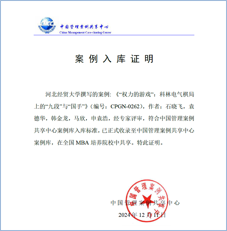 近日,星空体育官方网站教授石晓飞、2020级工商管理袁德华,2022级工商管理学研究生韩金龙,马欣,申袁浩撰写的教学案例《“权力的游戏”:科林电气棋局上的“九段”与“国手”》(编号:CPGN-0262)入选中国管理案例共享中心案例库。