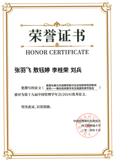 星空体育官网张羽飞博士、李桂荣教授、刘兵教授(通讯作者)及会计学院敖钰婷的合作论文《数智化能力对战略性新兴企业创新韧性的影响研究——兼论政府数字关注强度的调节效应》入选“技术与创新管理”分论坛,并荣获第十九届(2024)管理学年会优秀论文奖。