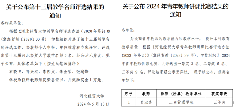 石晓飞教授荣获第十三届星空体育官方网站“教学名师”荣誉称号。史淑秀老师获2024年青年教师讲课比赛三等奖1项。