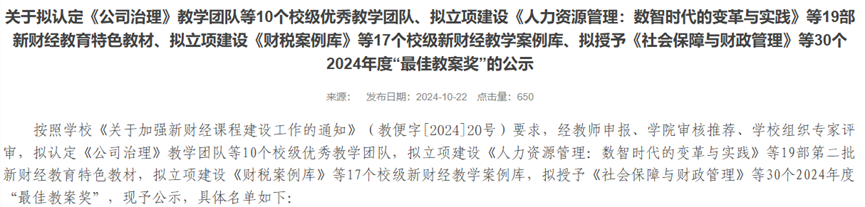 星空体育官网获批6门校级新财经特色课程,2门人工智能试点课程,2项新财经特色教材,1个新财经教学案例库。《公司治理》教学团队获评2024年校级优秀教学团队,3 门课程教案荣获2024年校级“最佳教案奖”。