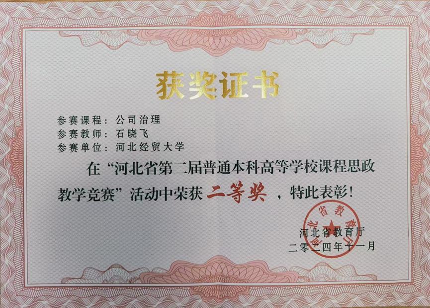 星空体育官网石晓飞教授《公司治理》荣获河北省第二届普通本科高等学校课程思政教学竞赛二等奖。