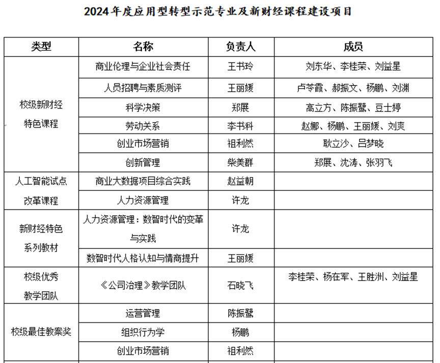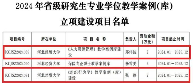星空体育官方网站多项研究生教育相关项目获得省级立项。其中,郑伟波教授主持的《<人力资源管理>教学案例库建设》和张静副教授主持的《<组织行为学>教学案例(库)建设》获批2024年省级研究生专业学位教学案例(库)立项建设项目。