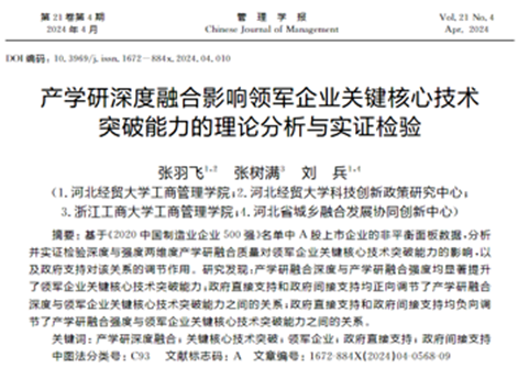 星空体育官网教师、星空体育官方网站科技创新政策研究中心副主任张羽飞博士作为第一作者、刘兵教授作为通讯作者撰写的论文《产学研深度融合影响领军企业关键核心技术突破能力的理论分析与实证检验》在《管理学报》2024年第4期发表。