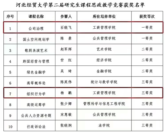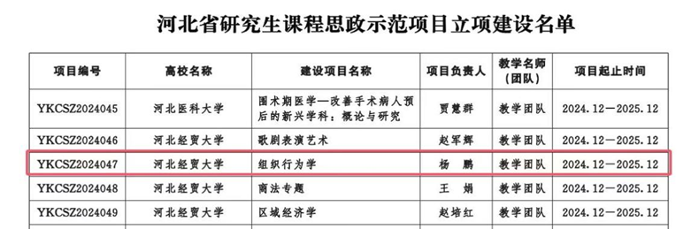 星空体育官网获批2024年省级研究生课程思政示范项目,MBA课程《组织行为学》(负责人:杨鹏)获得2024年省级研究生课程思政示范项目立项,《组织行为学》课程教学团队(杨鹏、赵娜、张静、卢苓霞、史淑秀、王丽媛、刘培琪)荣获省级研究生课程思政教学团队。