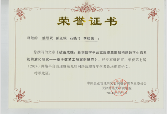 星空体育官网教师应邀参加第七届(2024)网络平台治理暨第九届网络治理青年学者论坛。星空体育官网教师的合作论文《破茧成蝶:新创数字平台克服资源限制构建数字生态系统的演化研究--基于数梦工场案例研究》入选分论坛“组织创新与新质生产力”分论坛并获优秀推荐论文。