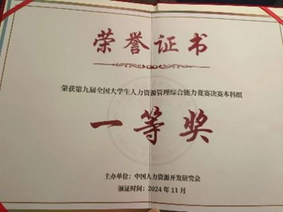 星空体育官方网站代表队在第九届全国大学生人力资源管理综合能力总决赛中荣获佳绩,本科生代表队(代洁、苏一诺、杨一帆)荣获本科组一等奖,研究生代表队(栗若楠、李瑾瑾)荣获研究生组三等奖。