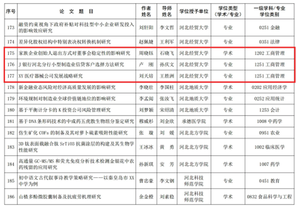 星空体育官方网站3篇论文荣获2021-2022学年度河北省优秀硕士学位论文、河北省优秀硕士论文。分别是2022届毕业生周晓钰(导师:石晓飞)的学位论文《家族企业创始人退出方式对董事会稳定性的影响研究》、卢刚(导师:孙庆文)的学位论文《J银行河北分行小型制造业信贷客户选择方法研究》、刘天培(导师:王胜洲)的学位论文《XY医疗器械公司发展战略研究》。