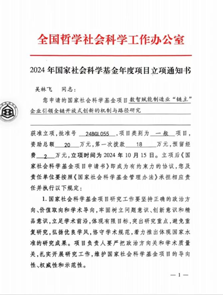 星空体育官方网站吴林飞博士主持的《数智赋能制造业“链主”企业引领全链开放式创新的机制与路径研究》项目获国家社科基金一般项目立项。