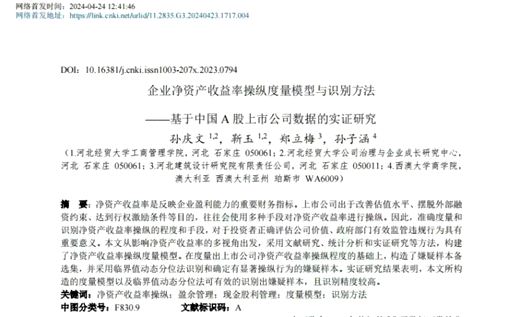 星空体育官网孙庆文教授和研究生靳玉的研究成果《企业净资产收益率操纵度量模型与识别方法——基于中国A股上市公司数据的实证研究》由《中国管理科学》期刊在中国知网上进行网络首发。