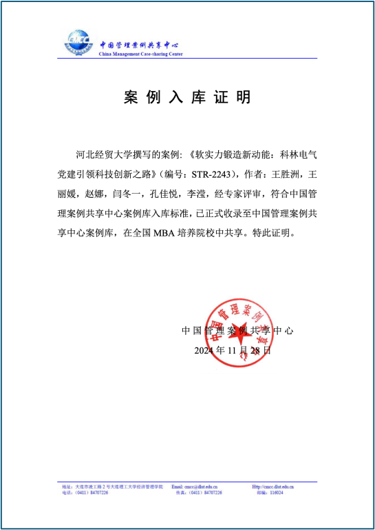 星空体育官网教师王胜洲、王丽媛、赵娜和科林电气股份有限公司李滢,带领硕士研究生闫冬一、孔佳悦合作撰写的教学案例《软实力锻造新动能:科林电气党建引领科技创新之路》(编号:STR-2243)入选中国管理案例共享中心案例库。