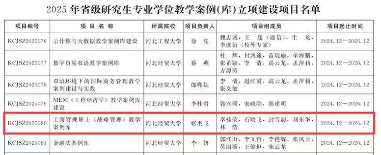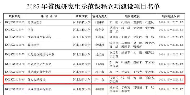 星空体育官网教师许龙副教授主持的《英文文献阅读》获批2025年省级研究生示范课程立项和张羽飞博士主持的《工商管理硕士<战略管理>教学案例库》获批2025年省级研究生专业学位教学案例(库)立项建设项目。