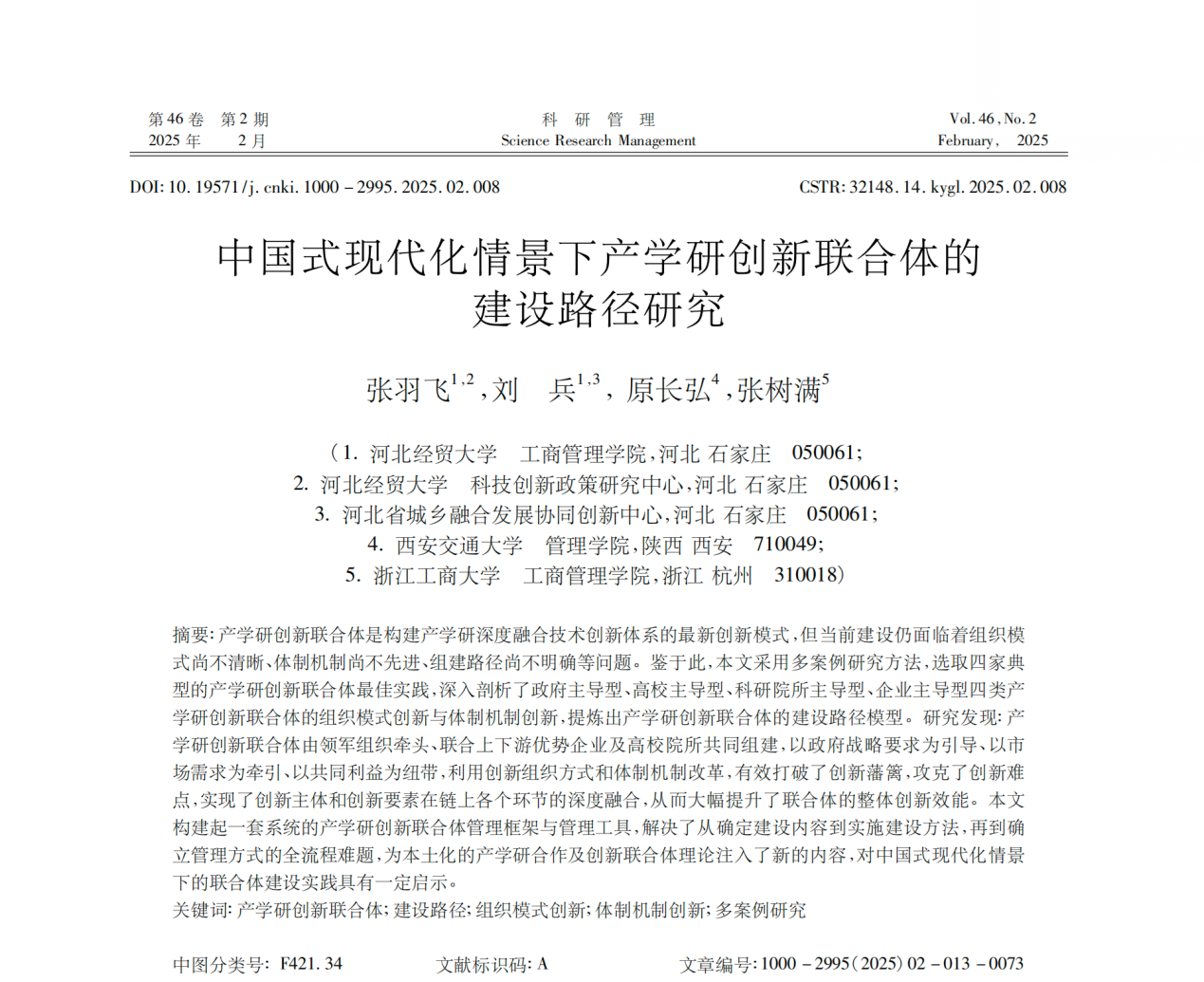 近日,星空体育官方网站讲师、星空体育官方网站科技创新政策研究中心副主任张羽飞博士作为第一作者撰写的论文《中国式现代化情景下产学研创新联合体的建设路径研究》在国家自然科学基金委员会认定的A类重要期刊《科研管理》正式刊出。