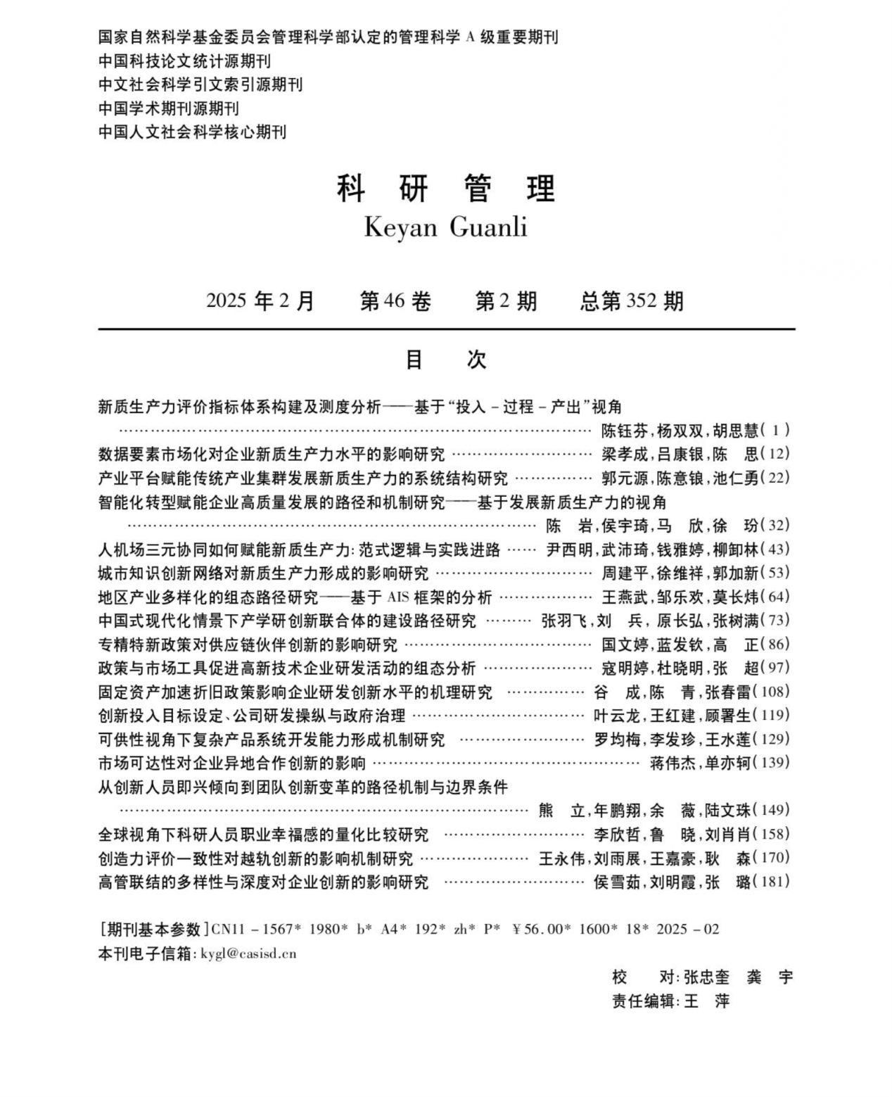 《科研管理》是由中国科学院、中国科学院科技政策与管理科学研究所主管,中国科学院科技战略咨询研究院、中国科学学与科技政策研究会、清华大学技术创新研究中心主办的学术刊物,被国家自然科学基金委员会管理科学部遴选和认定为管理科学 A 类重要期刊,被《FMS管理科学高质量期刊推荐列表》收录为T 1级期刊。同时,《科研管理》是“中国学术期刊综合评价数据库”统计源期刊(CAJCED)、“中国科技论文统计源期刊”(中国科技核心期刊ISTIC)、“中文社会科学引文索引来源期刊”(CSSCI)、“中国科学引文数据库来源期刊”(CSCD);被“中国人文社会科学核心期刊”“中国学术期刊专题文献数据库”“中国核心期刊(遴选)数据库”和“中国期刊全文数据库”(CJFD)全文收录。根据《中国学术期刊影响因子年报》(人文社会科学·2024版),期刊复合影响因子为7.711。