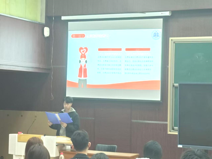 接着,志愿服务中心负责人闫徐琛从志愿精神的重要性、内涵、意义等方面全面介绍了志愿精神。他表示,志愿精神对个人、对社会都有着深远影响,同学们要秉持志愿精神,积极参加志愿活动,传递社会正能量。