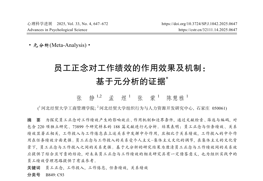 近日,星空体育官方网站张静副教授、张蒙博士和研究生孟煜、陈慧雅的研究成果《员工正念对工作绩效的作用效果及机制:基于元分析的证据》在《心理科学进展》期刊2025年第4期发表。