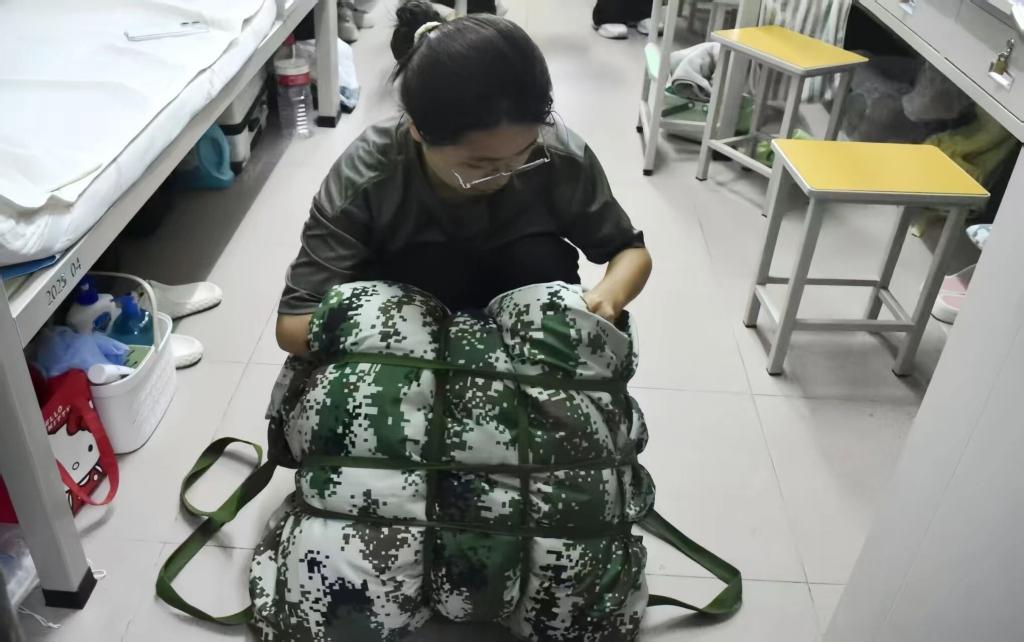 同学们严格遵照军训叠被标准,各自在床前站定就绪。随着教官一声令下,叠被团体赛正式开始,大家立刻投入状态,争分夺秒地铺平被面、压实边角、叠出规整形状。每个人都专注于自己的动作,手指快速整理被角,眼神紧盯叠被线条,全力朝着“又快又好”的目标冲刺。
