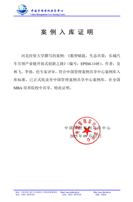 近日,星空体育官方网站讲师吴林飞博士和2024级工商管理学研究生李倩撰写的教学案例《数智赋能,生态共荣:长城汽车引领产业链开放式创新之路》(编号:EPSM-1105)入选中国管理案例共享中心案例库。