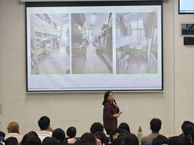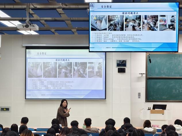 最后,优秀宿舍代表刘竹结合实践经验分享建设心得。她指出,宿舍要以学为基,聚焦专业课难点展开研讨,让互助学习成为日常;以洁为要,推行轮流值日制度,用清晰分工压实责任,在长期坚持中,逐步形成互督共进、默契十足的良好氛围。这些源于实际的鲜活做法,不仅让在场学生直观掌握了优质宿舍的打造逻辑,更为后续宿舍文明创建提供了有力借鉴。