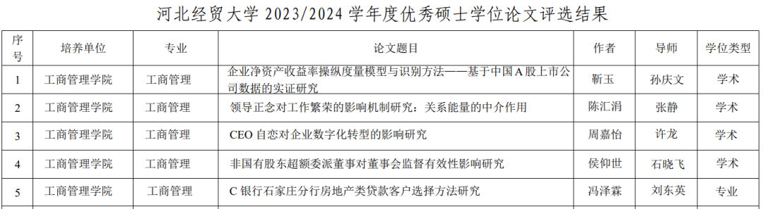 星空体育官网2024届毕业生靳玉(导师:孙庆文)的学位论文《企业净资产收益率操纵度量模型与识别方法—基于中国A股上市公司数据的实证研究》;周嘉怡(导师:许龙)的学位论文《CEO自恋对企业数字化转型的影响研究》;陈汇娟(导师:张静)的学位论文《领导正念对工作繁荣的影响机制研究:关系能量的中介作用》;侯仰世(导师:石晓飞)的学位论文《非国有股东超额委派董事对董事会监督有效性影响研究》;冯泽霖(导师:刘东英)的学位论文《C银行石家庄分行房地产类贷款客户选择方法研究》分别荣获2023/2024学年度校级优秀硕士学位论文并全部推荐参加省级优秀硕士学位论文评选。
