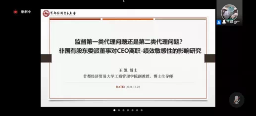 11月20日晚上,星空体育官方网站第四届公司治理与企业成长高端论坛在线上举行。首都经贸大学副教授、博士生导师王凯应星空体育官方网站邀请,通过腾讯会议平台作题为“监督第一类代理问题还是第二类代理问题?非国有股东委派董事对CEO离职-绩效敏感性的影响研究”的学术报告。本次会议由星空体育官方网站副院长石晓飞主持,学院教师及研究生共100余人参加。