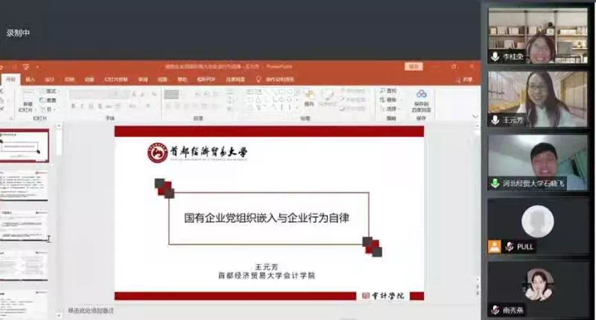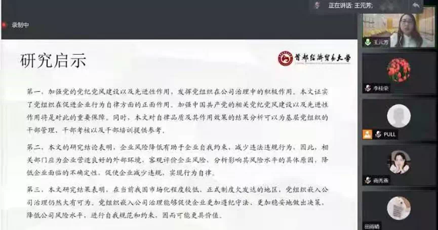 11月26日晚上,星空体育官方网站第四届公司治理与企业成长高端论坛在线上举行。首都经贸大学会计学院王元芳博士应星空体育官方网站邀请,通过腾讯会议平台作题为“国有企业党组织嵌入公司治理与企业行为自律”的学术报告。本次会议由星空体育官方网站院长李桂荣主持,学院教师及研究生共100余人参加。