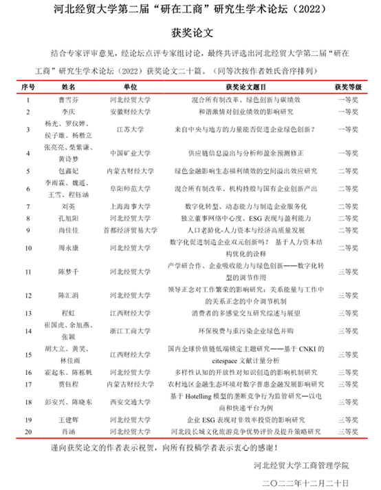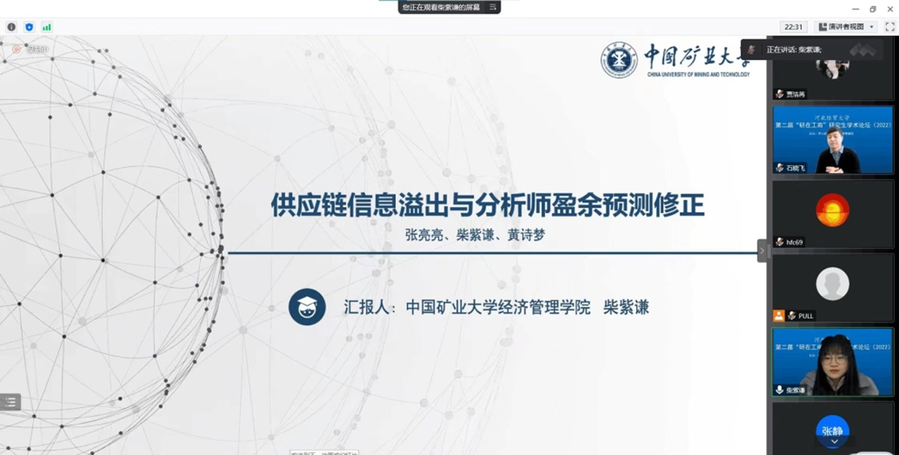 此次论坛自发布公告起,共收到来自西安交通大学、北京科技大学、中国矿业大学、浙江工商大学、首都经济贸易大学、江西财经大学等17所高校的45篇论文,其中8篇进行线上报告,包括中国矿业大学柴紫谦、首都经济贸易大学尚佳佳、安徽财经大学李庆、阜阳师范大学李雨霖、江苏大学杨光、星空体育官方网站孔旭阳、周永康、曹雪芬的论文。四位评委专家对以上八位同学的论文进行了针对性点评,提出了专业性指导意见。最终,结合评审专家意见和点评专家意见,评选出一、二、三等奖共20篇。