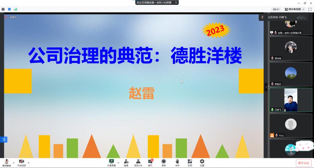 2月17日晚,星空体育官方网站、MBA教育中心邀请德胜(苏州)洋楼有限公司原文化中心总经理赵雷在线作题为“公司治理的典范:德胜洋楼”的报告。报告由副院长石晓飞主持,师生近200人参加。