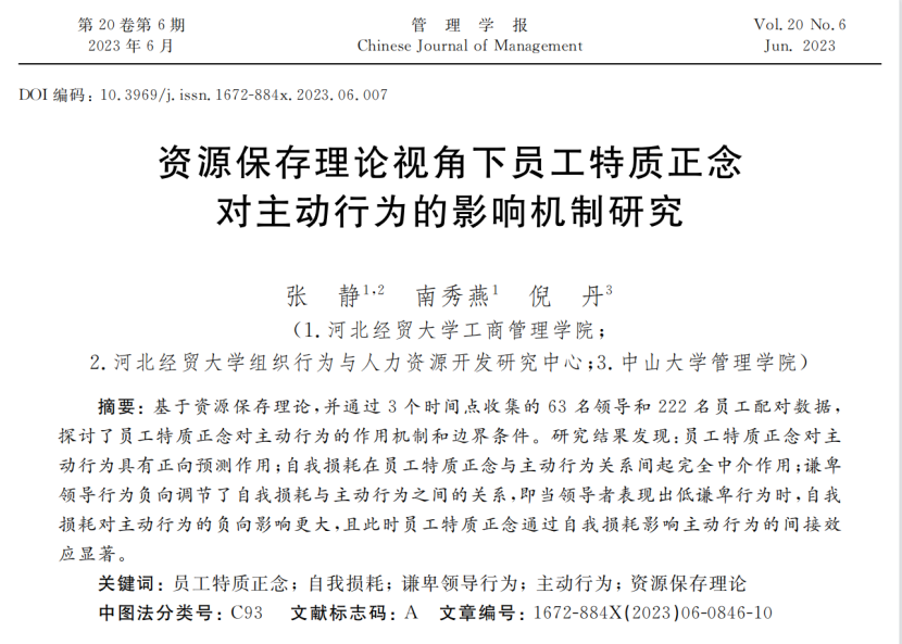 近日,星空体育官方网站张静副教授和研究生南秀燕与合作者中山大学管理学院倪丹助理教授的研究成果《资源保存理论视角下员工特质正念对主动行为的影响机制研究》在《管理学报》期刊2023年第6期上发表。