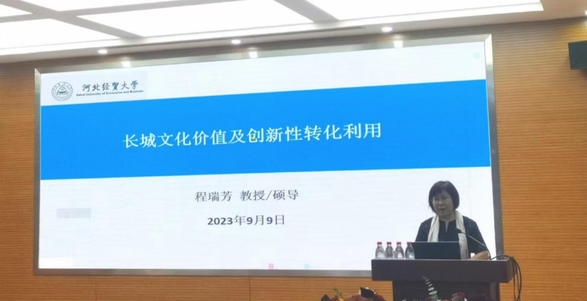 在教师节即将到来之际,报告开始前,MBA在读研究生为程瑞芳教授送上了衷心的祝福,感谢老师的谆谆教导。随后,程瑞芳教授从长城概况、长城的修筑与文化价值、长城的保护与转化利用途径、发展长城文化经济带资源条件和政策环境以及发展长城文化旅游绿色产业带这五个方面展开讲解。首先,她简单介绍了长城的分布、长城目前的留存现状等基本概况。其次,阐述了长城的文化价值,长城不仅是古代修筑的综合防御体系,也代表着古代远大的政治战略思想,是社会治理的一种重要方式,蕴含着重要文化价值,具有无与伦比的象征意义。再次,介绍了目前长城遗产的保护现状,指出新中国成立后,长城的保护也进入了一个新阶段,为保护长城文化遗产,有关部门颁发了相关保护条例。最后,她指出长城已经形成一种文化,我们应该将长城文化加以转化利用、发展长城文化经济带和长城文化旅游绿色产业带,并以河北省为例,提出了切实可行的方法。她指出,我们要尽全力发展长城文化旅游,发挥长城的世界窗口作用,同时提升中华文化的传播能力和影响力。