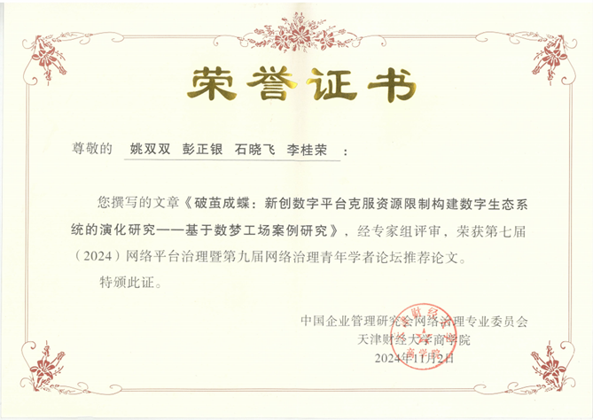 本届会议设置了“数字责任与绿色治理”“数据要素与平台治理”“数字赋能与数字化转型”“组织创新与新质生产力”四个主题分论坛。来自多所高校的学者与参会代表,围绕分论坛主题进行了论文研讨与交流,本届年会共计收到论文投稿200余篇,录用论文40篇,最终8篇获得优秀推荐论文奖。星空体育官网教师的合作论文《破茧成蝶:新创数字平台克服资源限制构建数字生态系统的演化研究--基于数梦工场案例研究》入选分论坛“组织创新与新质生产力”分论坛并获优秀推荐论文。
