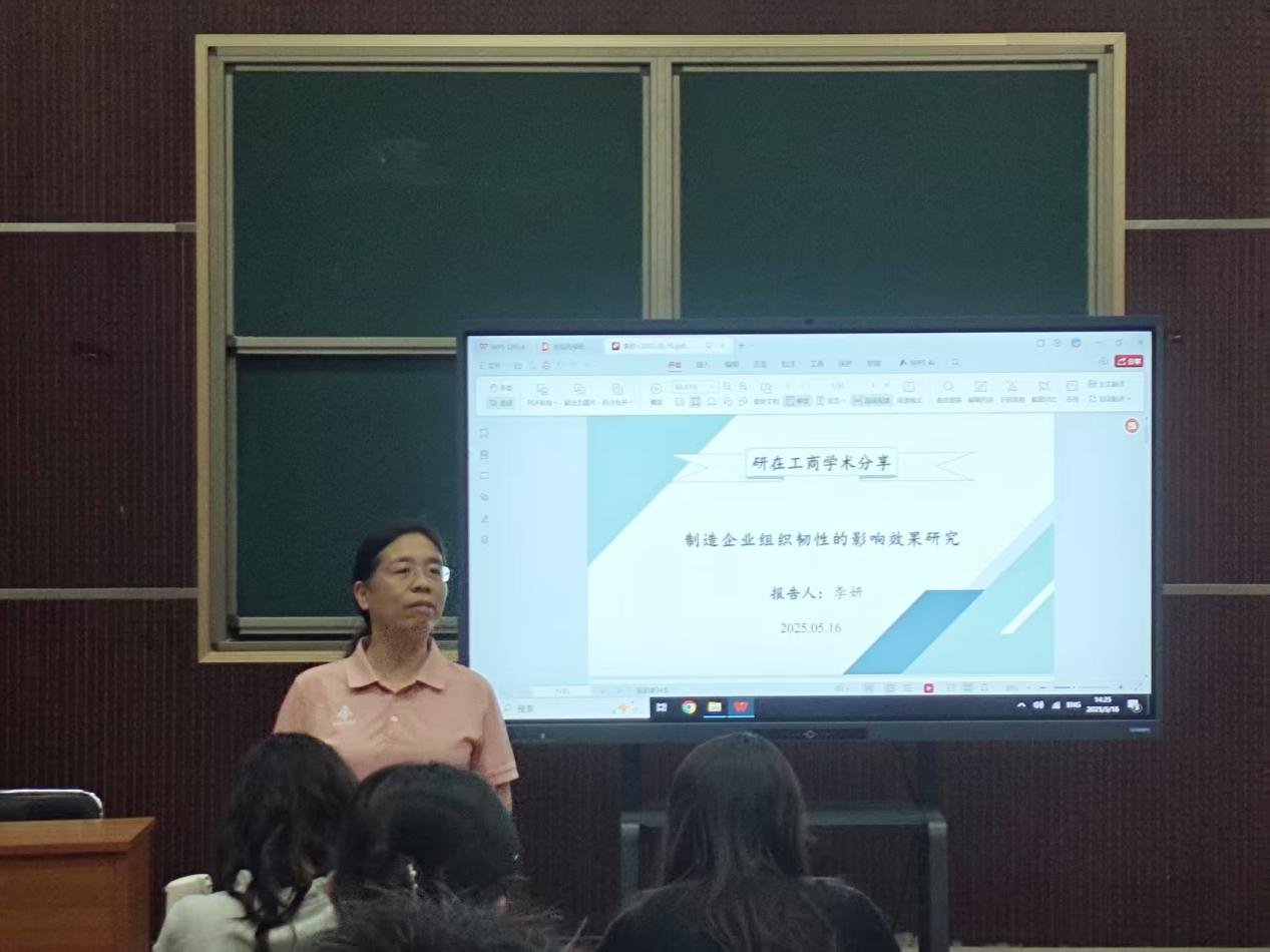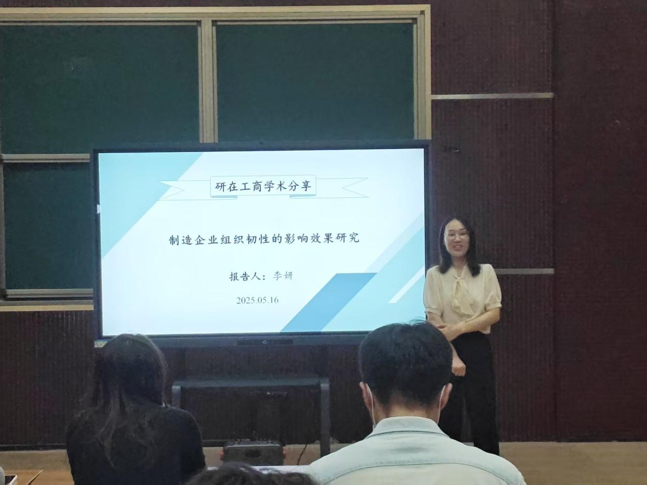 5月16日,研究生学术节系列活动之第四十一期“研在工商”青年学术沙龙于MBA一教室举行,由星空体育官方网站李妍博士作题为“制造企业组织韧性的影响效果研究”的学术报告。本次沙龙由星空体育官方网站院长李桂荣教授主持,学院青年博士教师及全体学术型研究生参加。