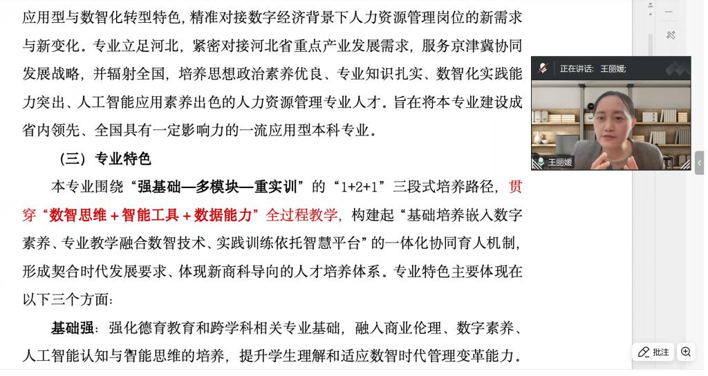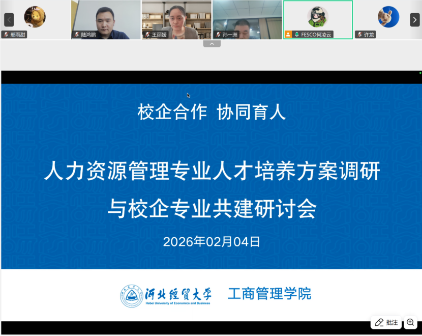 为落实学校《“人工智能+”新财经本科人才培养改革2.0计划》和教务处2026版本科专业人才培养方案修订调研要求,对接数智化时代人力资源管理行业人才需求,推进校企协同调研,2月4日,星空体育官方网站人力资源管理系线上召开2026版本科人才培养方案“数智赋能校企共建”调研研讨会。会议由系主任王丽媛主持,全体教师参会,特邀河北方胜、北京外企等企业专家指导。校企双方围绕行业人才需求、培养方案优化、协同育人等核心内容深度研讨,为科学修订方案提供行业视角与实践支撑。